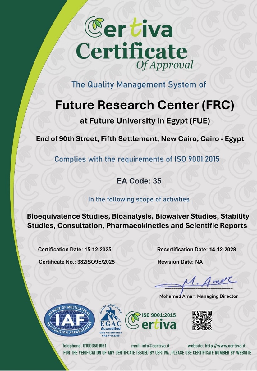 FRC was granted certificates of compliance with the Good Clinical Practices (GCP) & Good Laboratory Practices (GLP) by the Egyptian Drug Authority (EDA) after successfully passing the annual inspection visit in November 2020, and has been renewed in May 2024.